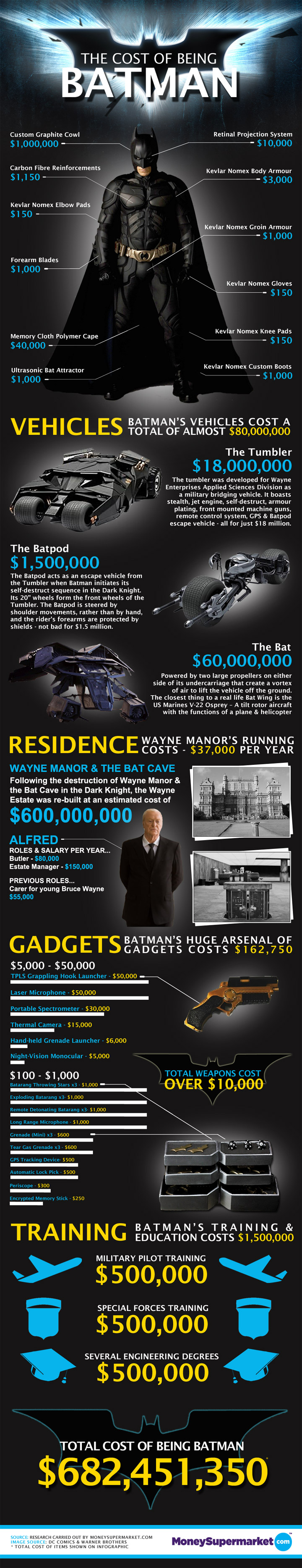 Tony Stark and Bruce Wayne are both depicted as being fabulously wealthy heirs to vast fortunes and globe-spanning corporations. As the infographics show of what it costs to power their superhero lifestyles, they’d need every extra cent they’d get in order to be Iron Man/Batman.